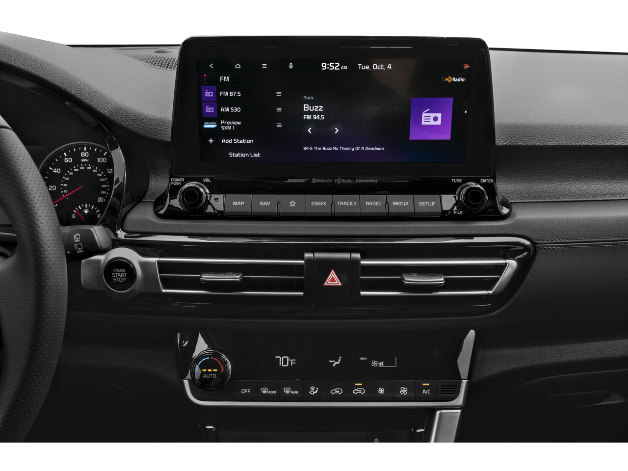 - Radio: AM/FM/MP3 Display Audio w/Navigation -inc: 10.25" touch screen, satellite radio, UVO telematics, Android Auto, Apple CarPlay, voice recognition, USB connectivity and Bose premium sound system w/8 speakers including subwoofer